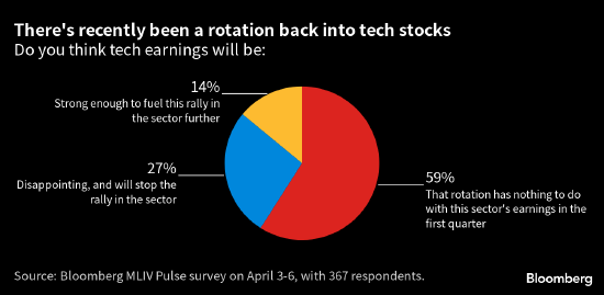 在此次彭博调查中,逾四分之一的受访者预计财报将浇灭科技股的行情。只有14%的人看好它进一步上涨。