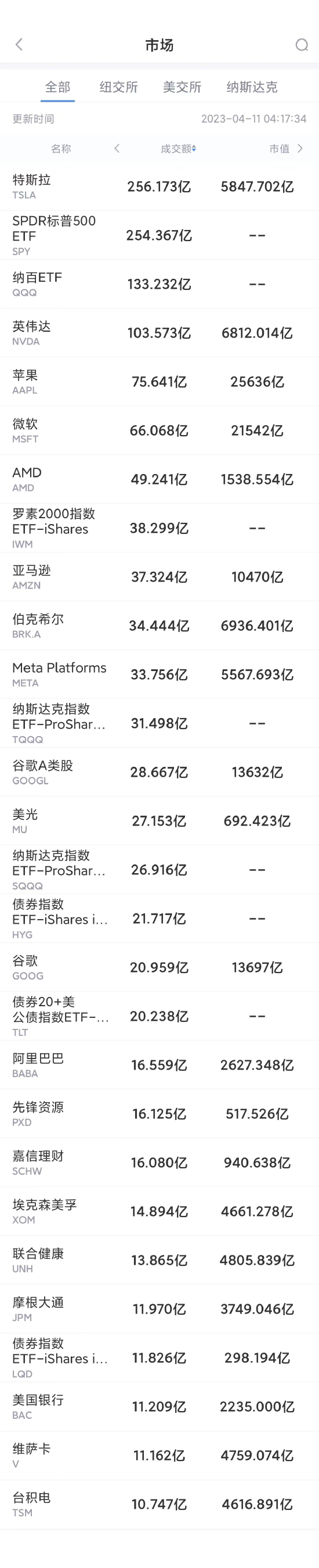 以下为美股当日交易最活跃的20只股票(按成交额):