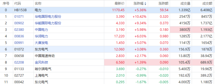 港股电力股早盘普涨,华电国际电力股份大涨超10%,华能国际电力股份涨超9%,中国电力、华润电力涨6%,大唐发电涨超5%。