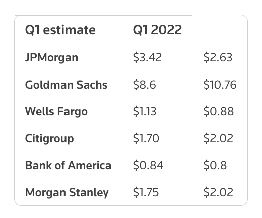 路透分析师预计,美国六大行的每股收益预计将较去年同期下降10%。4月14日(周五)美国银行股的首份业绩将出炉,并将拉开美股一季度业绩报告的序幕。