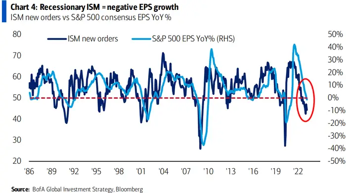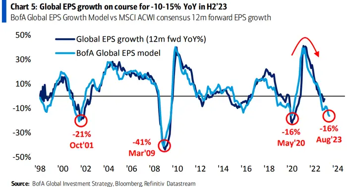 美国银行表示,美银全球每股收益增长模型目前预测,到8月份,每股收益将同比下降16%。这种模式受到亚洲出口、全球采购经理人指数(PMI)、中国金融状况和美国收益率曲线的驱动。