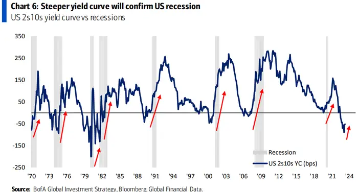 Hartnett的团队认为,经济衰退开始时应该采取的策略是做多黄金、美国国债、周期性的资产(例如银行、房地产投资信托基金、大宗商品等)以及收益率曲线变陡交易。他们说: