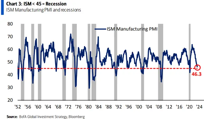 3月美国ISM制造业指数录得46.3,为2020年5月以来最低。Hartnett认为,在过去70年里,制造业ISM指数曾12次低于45,其中11次发生衰退(1967年除外)。美银分析师说: