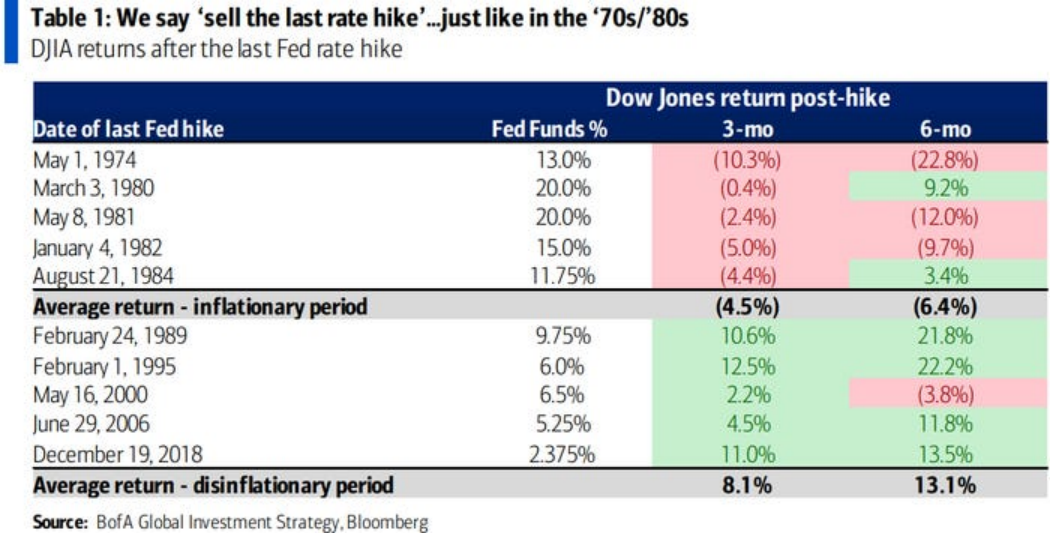 随着美联储接近加息行动的终点,曾预测了去年美股暴跌的美银首席策略师Michael Hartnett领导的团队上周四在报告中建议客户趁美联储最后一次加息之时卖出或是减持股票配置,美银认为这在1970年代和1980年代的通胀时期属于“正确策略”。