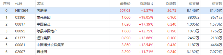 盘面上看,龙光集团一度暴涨23%,中国金茂涨超17%,碧桂园涨超11%,绿景中国地产、时代中国控股、宝龙地产纷纷涨超10%。