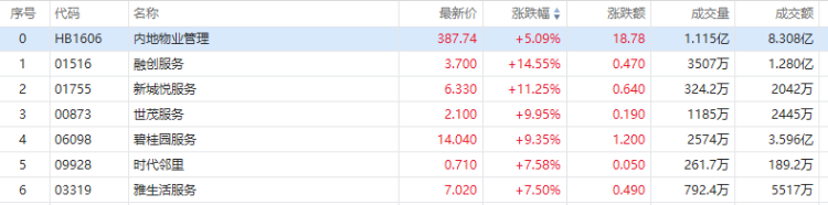 物管股也拉升走高,融创服务一度涨超16%,新城悦服务涨超13%,碧桂园服务涨超9%,世茂服务、宝龙商业、时代邻里、合景悠活等纷纷走强。