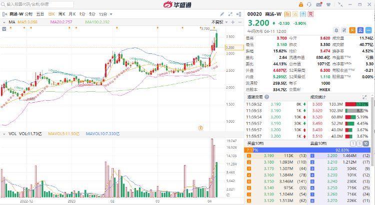 受推出大模型体系“商汤日日新大模型”影响,昨日商汤的股价曾大涨12.8%,今日开盘也是涨近9%,截止午盘,商汤-W报3.2港元/股,跌3.9%。