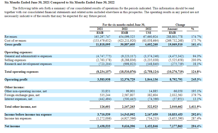 其中,货运代理服务收入从截至2021年6月30日的6个月的人民币1.386亿元增加到截至2022年6月30日的6个月的人民币4.122亿元,同比增长197.5%。主要由于包机货运服务新航线的发展,占总收入的25.9%。
