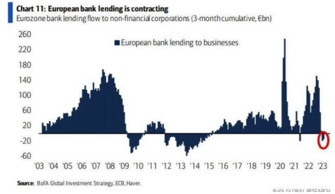 美国银行团队援引欧洲央行的数据显示,欧洲银行对非金融公司的贷款已连续三个月收缩。在非经济危机时期,如此明显的经济放缓是罕见的。