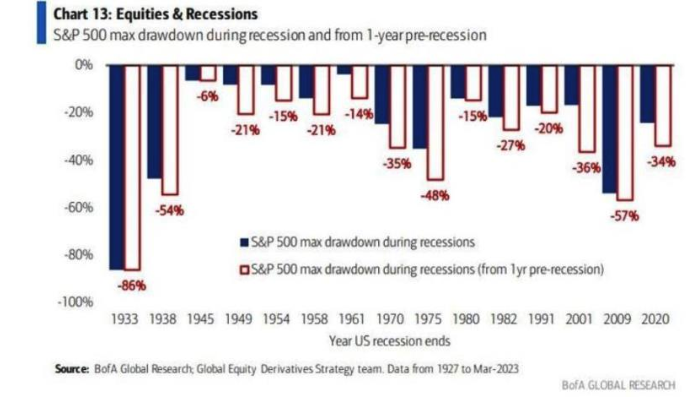 尽管交易员们希望经济衰退,将意味着美联储加息的结束,这有助于激发股市的大幅抛售。历史表明,美国股市很少能在经济衰退中毫发无损。 在过去10次衰退中,标普500指数有8次比一年前下跌了20%以上。这意味着,正如美国银行团队所预期的那样,如果全球经济继续恶化,股市仍有下跌的空间。