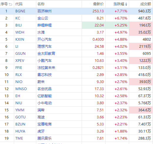 跌幅榜中,优信二手车跌超10%,贝壳跌超3%,阿里巴巴、百度跌超1%。