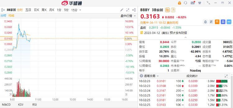 华盛资讯4月11日消息,WSB概念股走强,截至发稿,3B家居涨近7%,AMC院线、游戏驿站涨超2%,SAVA、高斯电子跟涨。