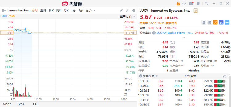 Innovative Eyewear飙升,截至发稿,该股暴涨超150%,此前宣布推出首款支持ChatGPT的智能眼镜。