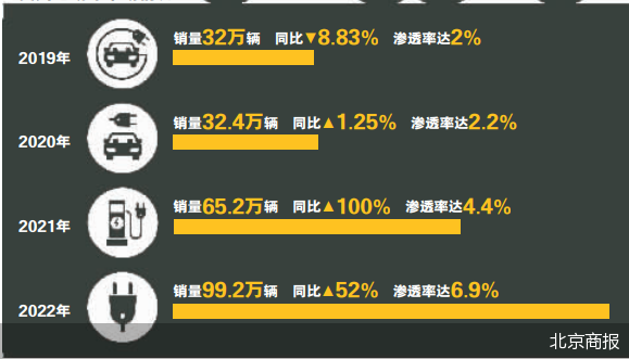 对美国来说,想要实现该目标依然有一段路要走。数据显示,2018-2020年,美国新能源汽车销量持续在35万辆左右,新能源汽车渗透率在2%左右徘徊。2021年新能源汽车销量首次出现突破,达到68万辆左右,新能源汽车渗透率提升至3.2%。