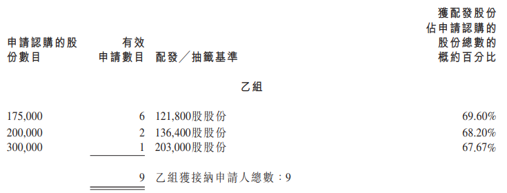 北森控股每手200股,申购一手中签率25%,申购8手稳中1手;乙组共9人,乙头获配609手。