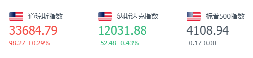 截至周二收盘,道指收盘上涨98.27点,涨幅为0.29%,报33684.79点;纳指跌52.48点,跌幅为0.43%,报12031.88点;标普500指数跌0.17点,报4108.94点。