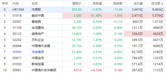 华盛资讯4月13日消息,港股内房股早盘集体回调,截至发稿,融创中国复牌大跌超41%,碧桂园跌超4%,龙湖集团、中国金茂、新城发展跌超3%,华润置地跌超2%。