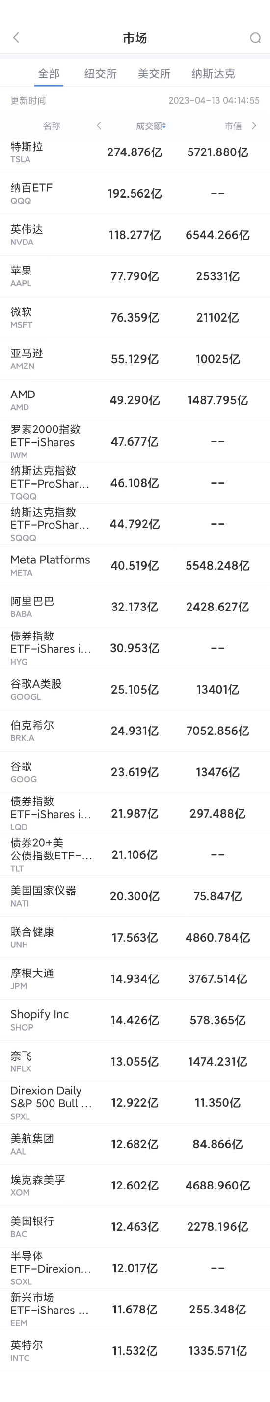 以下为美股当日交易最活跃的20只股票(按成交额):