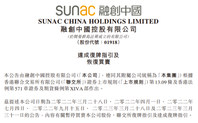 头部出险房企迎来复牌消息,融创官宣 $01918.HK 4月13日起复牌