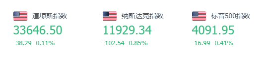截至周三收盘,道指收跌38.29点,跌幅为0.11%,报33646.50点;纳指跌102.54点,跌幅为0.85%,报11929.34点;标普500指数跌16.99点,跌幅为0.41%,报4091.95点。大型科技股多数下跌,特斯拉跌超3%,亚马逊、奈飞跌超2%。热门中概股普跌,京东跌超7%,哔哩哔哩跌超6%,满帮、小鹏汽车、蔚来、拼多多跌超5%。阿里巴巴美股盘后一度下跌超4%,消息称软银计划减持大部分持股。