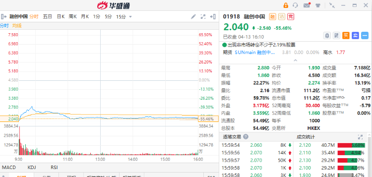 4月13日,复盘首日,融创中国盘中股价一度大跌近60%,截至收盘,融创中国跌55.46%,报2.04港元。