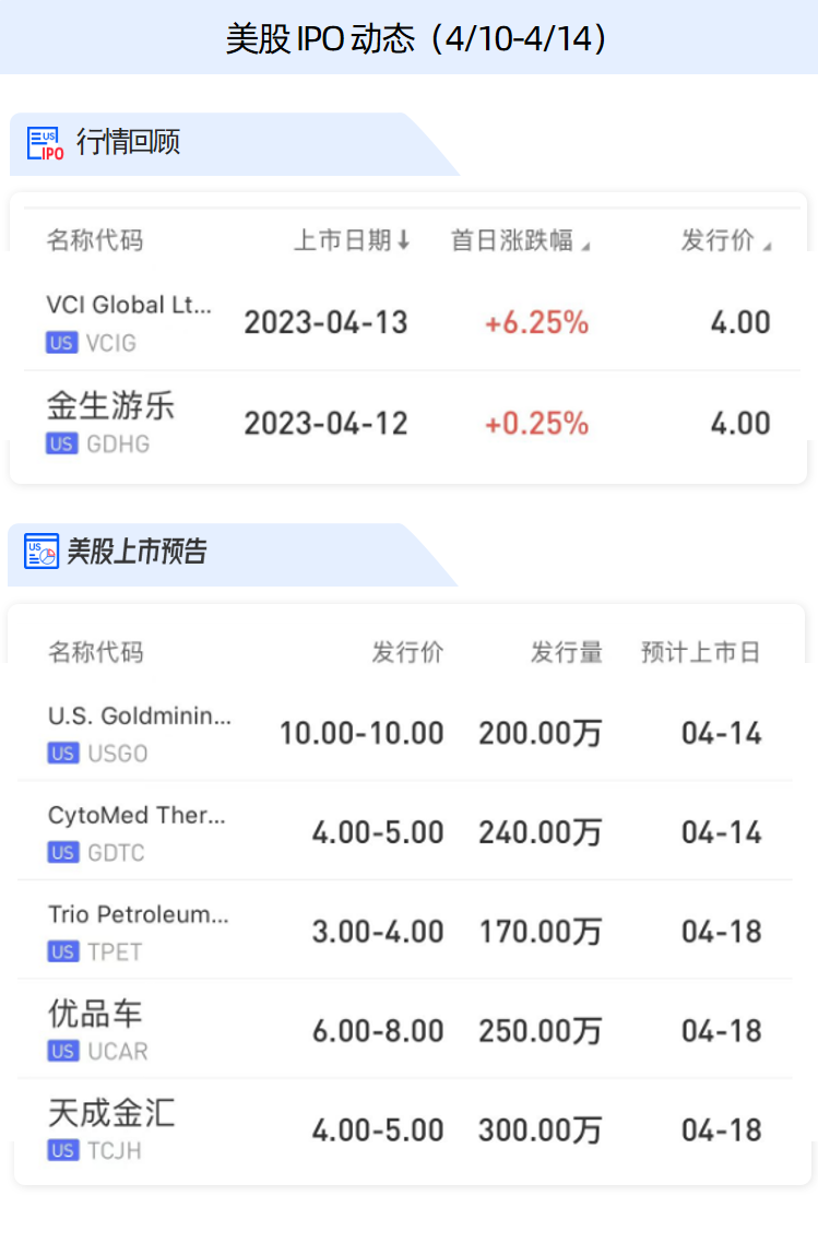 中国游乐园运营商金生游乐在中国南方管理和经营着六个游乐园、水上乐园和配套的娱乐设施。2022财年,公园内娱乐设施收入3937.8万美元,游客总数达240万人次。公司于4月12日上市,发行价4美元,首日微涨0.25%,全天成交额368.3万美元。