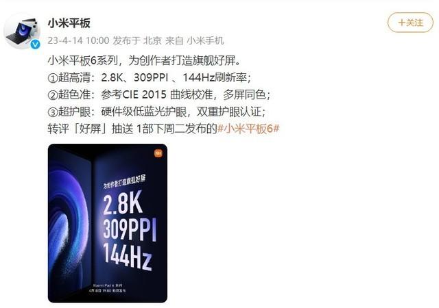 小米将于4月18日晚七点左右召开新品发布会,届时将推出小米 Pad 6 系列平板电脑。今日,小米平板官方宣布,新品将搭载2.8K显示屏,并支持144Hz刷新率。此外,屏幕还采用了CIE 2015曲线校准技术,显示色差更小。