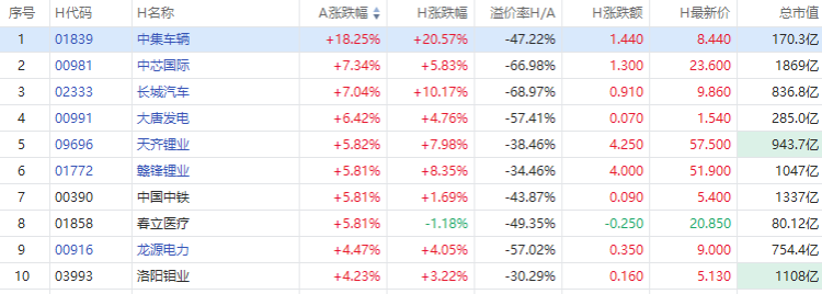 截至发稿,中集车辆A股涨18.25%,H股现涨20.57%,中芯国际A股涨7.34%,H股现涨5.83%,大唐发电A股涨6.42%,H股现涨4.76%。