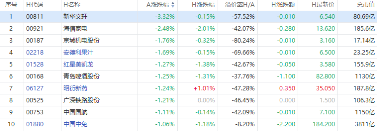 海信家电A股跌2.48%,H股现跌2.01%;京城机电股份A股跌1.76%,H股现跌0.32%,昭衍新药A股跌1.24%,H股现涨1.18%。
