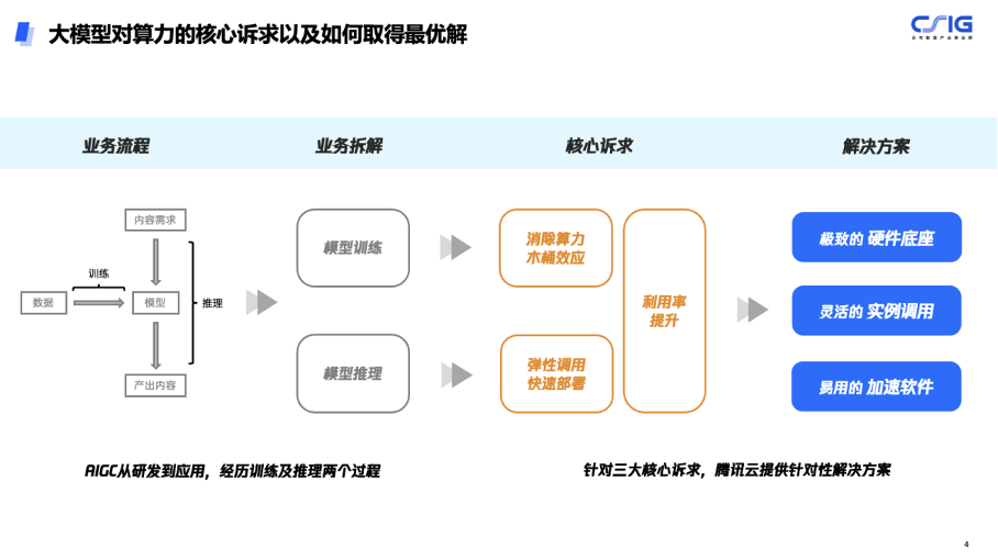 面对业务架构多样、用量无法准确预估、模型及环境部署难度大等问题,腾讯认为,云上算力能帮助企业完成随机突发的算力需求。