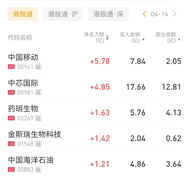 南向资金今日净买入港股33.56亿元。中国移动、中芯国际、药明生物分别获南向资金净买入5.78亿港元、4.85亿港元、1.63亿港元。盈富基金净卖出额居首,金额为3.05亿港元。