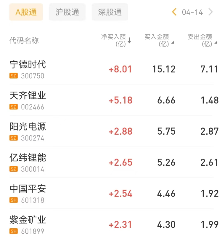 北向资金今日净买入64.24亿元。宁德时代、天齐锂业、阳光电源分别获净买入8.01亿元、5.18亿元、2.88亿元。药明康德净卖出额居首,金额为3.32亿元。