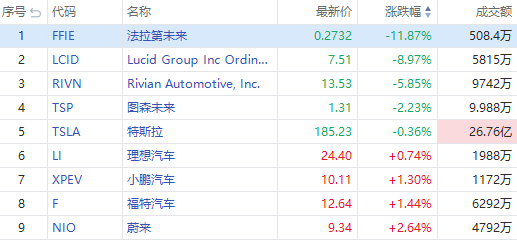 新能源车板块涨跌互现,法拉第未来跌近12%,FF 91交付时间再推迟。Lucid跌近9%,首季交付1406辆汽车不及预期;Rivian跌近6%,特斯拉微跌。涨幅榜中,蔚来涨近3%,福特汽车、小鹏汽车涨超1%。