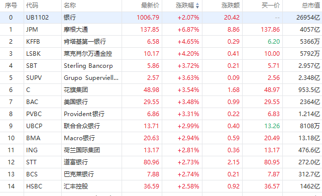 美股银行股普涨,截至发稿,摩根大通涨近7%,Q1业绩超预期。花旗、美国银行涨近4%,联合合众银行、巴克莱银行、西太平洋银行等涨超2%。