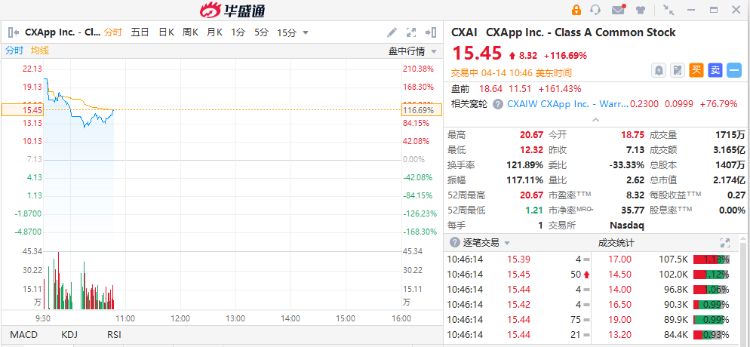 华盛资讯4月14日消息, CXApp早盘继续走强,截至发稿,现涨逾116%,值得关注的是,该股3日累计涨幅已超10倍。