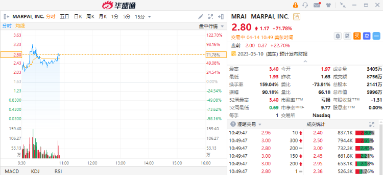 MARPAI飙涨超70%,报2.8美元,该股昨日收涨超90%。