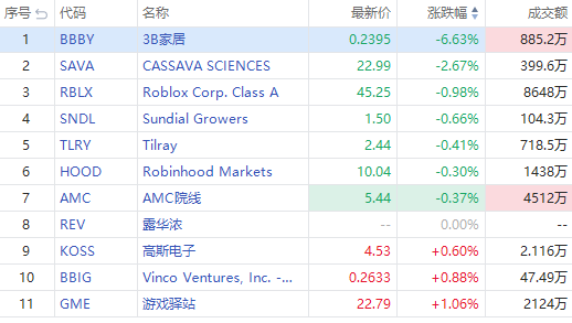 WSB概念股多数走低,截至发稿,3B家居跌近7%,SAVA跌近3%,Roblox跟跌;游戏驿站涨超1%。