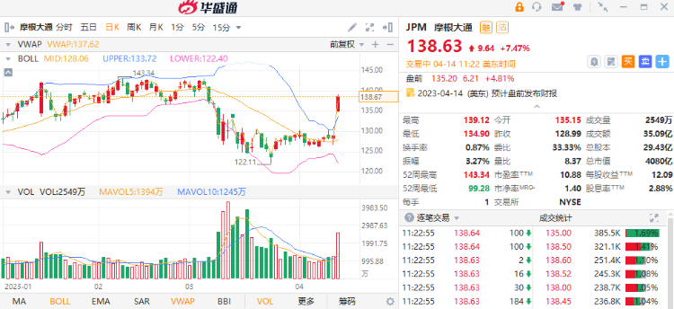 盘前美国最大的银行摩根大通公布的财报显示,得益于美联储的持续加息,该行营收创下历史新高,利润也超出市场预期。