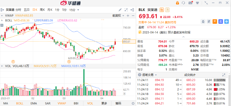 贝莱德周五在声明中表示,净流入该公司所有基金的资金总计1,100亿美元。包括共同基金和ETF在内的长期投资产品增加1,030亿美元,超过调查分析师平均预期的841亿美元。截至发稿,贝莱德股价涨超3%,报每股693.61美元。