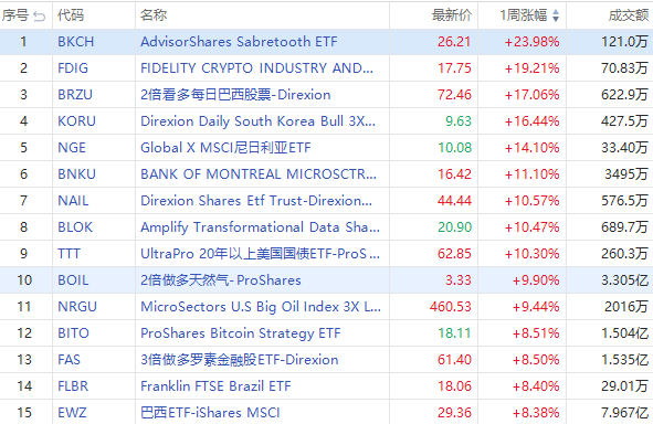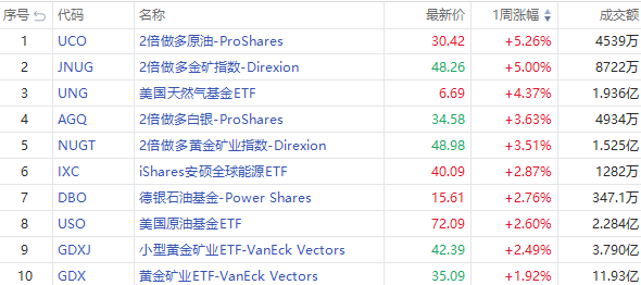 本周涨幅居前的为2倍做多原油 $UCO 近一周涨幅5.26%,德银石油基金ETF $DBO 涨2.76%,美国原油基金ETF $USO 涨2.6%。