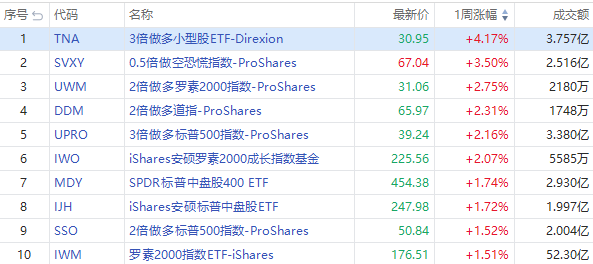 股指ETF方面,本周涨幅居前的均为做多ETF,中小盘股指数相关ETF领衔。3倍做多小型股ETF-Direxion $TNA 涨超4%,2倍做多罗素2000ETF $UWM 涨2.75%,SPDR标普中盘股400ETF $MDY 、iShares安硕标普中盘股ETF $IWO 、罗素2000指数ETF-iShares $IWM 皆涨超1%。