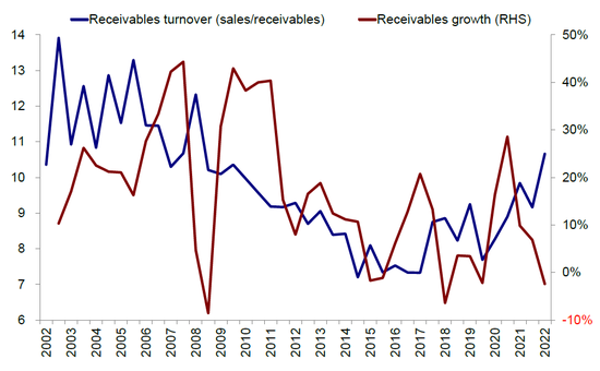 图表32:2022年应收账款周转率抬升,经济疲弱环境下企业重视资金周转效率