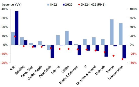 图表14:2022年下半年交通运输、能源、原材料等板块收入增速下行幅度最为明显