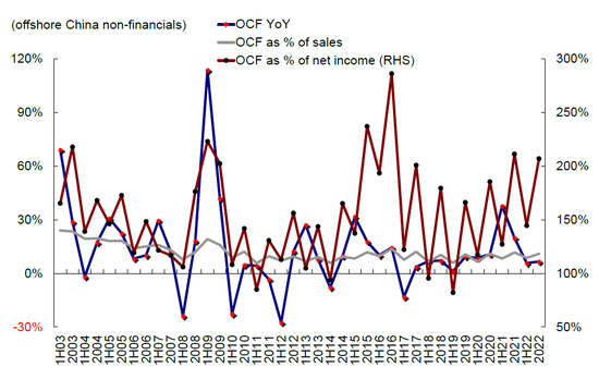 图表33:经营性现金流同比增速小幅上行,现金流改善