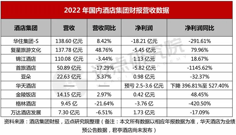2022年国内酒店集团财务营收表现:营收同比平均增长2.08%,净利亏损占主流