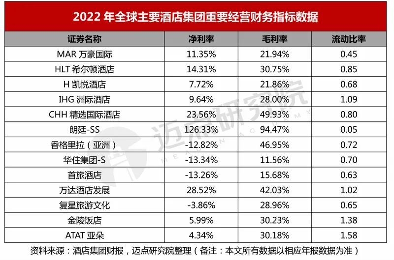 回首旅游住宿业的过去一年,既面临复杂多变的国际形势,又遭遇“口罩”影响,发展环境可谓是异常艰难。但上至地方政府,下至企业,都齐心协力,共同为文旅酒店行业的发展“出谋划策”并积极采取自救行动,在困境中韧性发展。本文以网络公开资料、各集团年度财务公告等内容为基础,从营业收入、净利润、净利率、净资产收益率、资产负债率等核心指标对国内外酒店集团2022年度的财务状况进行剖析解读,以期为酒店行业相关利益群体提供有益的价值参考。