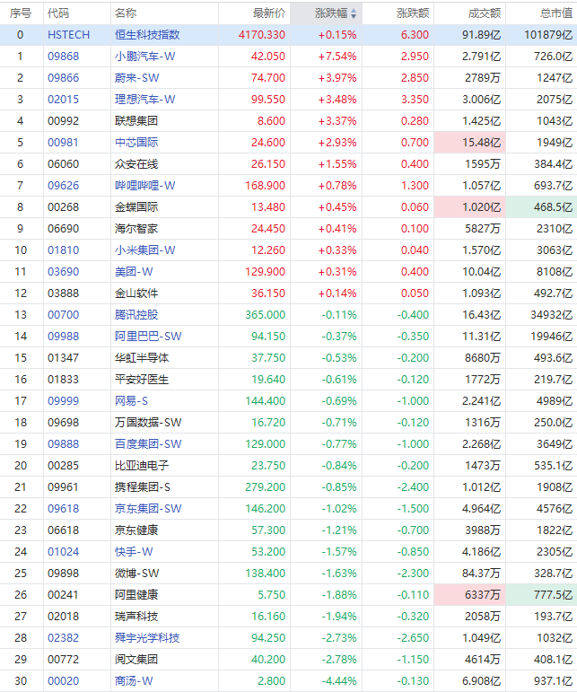 造车新势力走强,截至发稿,小鹏汽车-W涨7.54%报42.05港元每股,成交额2.79亿港元,理想汽车-W涨3.48%,蔚来-SW涨3.97%;中芯国际涨2.93%报24.6港元每股,成交额15.48亿港元,月内累涨超30%;华虹半导体跟涨。