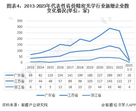 根据以上分析可知,精密光学产业链企业主要分布在广东、浙江、江苏等沿海发达地区;根据企查猫数据显示,以广东、浙江、江苏为例,沿海发达省市的精密光学行业历年新增企业数量呈上涨态势;2022年,广东省精密光学行业增企业数达到267家,江苏省精密光学行业增企业数达到122家,浙江省精密光学行业增企业数达到40家,沿海发达省市精密光学行业市场火热。
