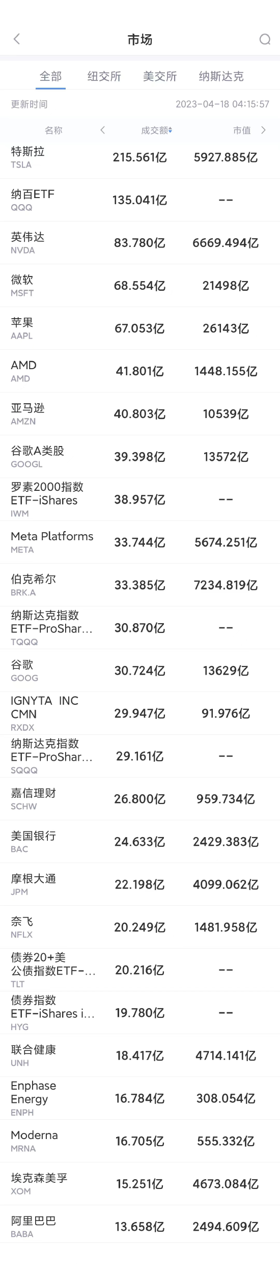 第12名嘉信理财收高3.94%,成交26.8亿美元。处于美国银行业危机漩涡中的嘉信理财公司周一公布一季度业绩。该公司一季度存款下降了30%,降至3257亿美元,降幅基本符合市场预期。