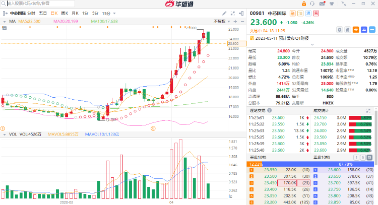 4月18日,芯片股高位回落。截至发稿,中芯国际(00981)跌4.26%,报23.6港元,成交额10.79亿港元;上海复旦(01385)跌4.55%,报27.3港元;华虹半导体(01347)跌4.48%,报36.25港元;ASMPT(00522)跌1.21%,报73.3港元。